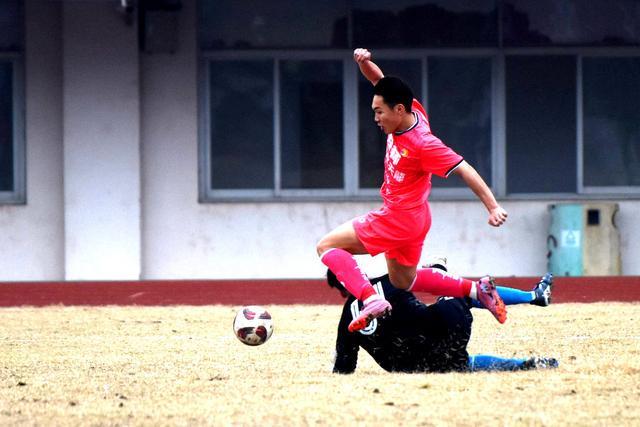 桂林市七星区队球员晃倒门将瞬间。 记者刘菁 摄